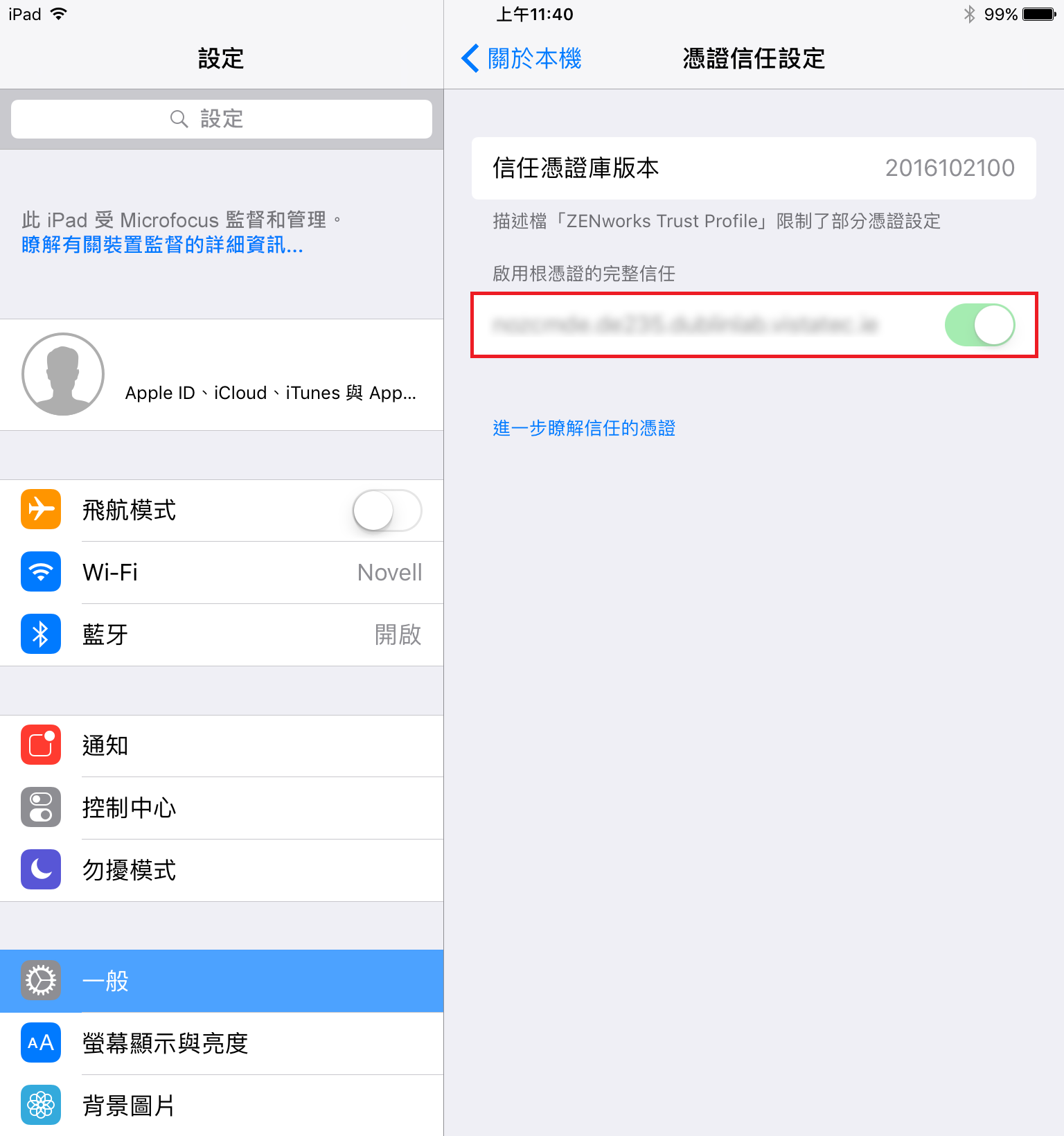 (視情況而定) 在裝置上啟用註冊證書。執行 iOS 10.3 或更新版本的裝置上會顯示此步驟。若要啟用證書︰