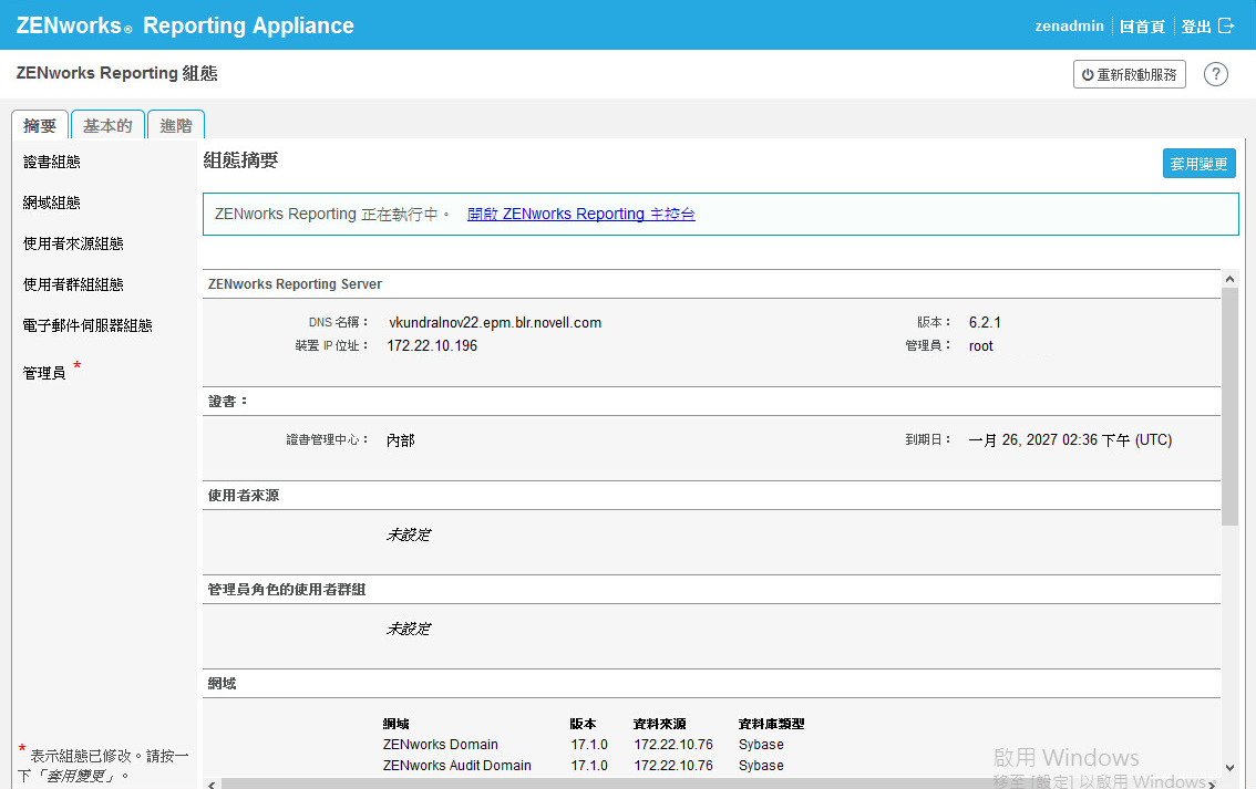 若要重新設定網域,請參閱節 4.1, 設定 ZENworks Reporting 的步驟 10。