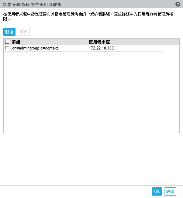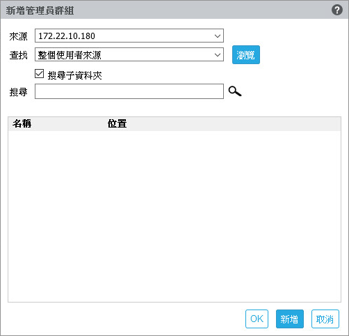 搜尋︰ 指定您要搜尋的群組名稱或者幾個包含群組名稱的字元,然後按一下搜尋圖示。搜尋容器中包含搜尋文字的群組名稱即會顯示。您可以從搜尋結果中選取一或多個群組,然後按一下確定以新增使用者群組。或者,如果您要設定這些群組並繼續,可以按一下新增。