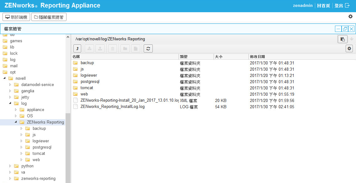 在 ZENworks Reporting Appliance 上監控的所有記錄檔案都是以虛擬樹狀結構的形式組織的,系統會顯示特定檔案或資料夾的路徑。可以在「追蹤」模式或「從頭開始檢視」模式下檢視記錄檔案。