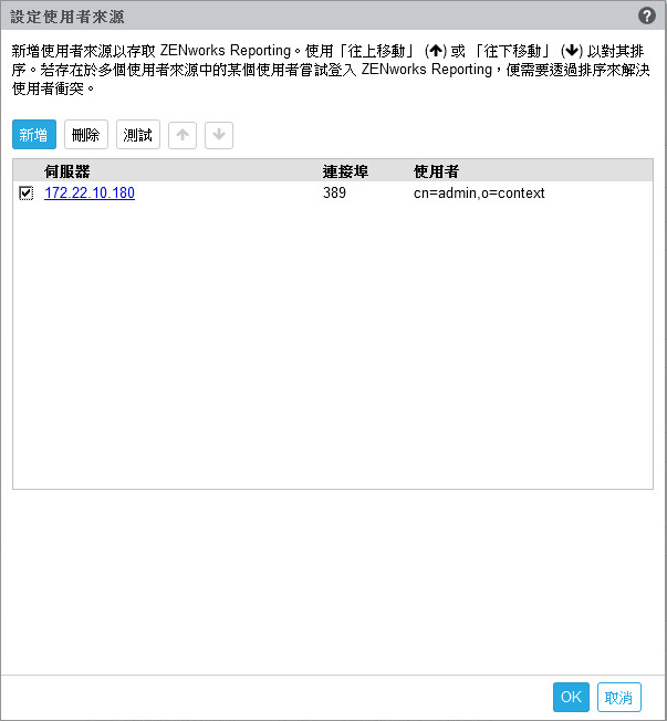 刪除: 選取要移除的使用者來源並按一下刪除。如果刪除了使用者來源,該使用者來源中的使用者將無法存取 ZENworks Reporting。