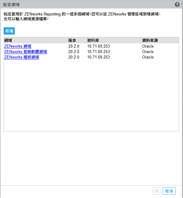 指定要用於 ZENworks Reporting 的一或多個網域。您可以從 ZENworks 管理區域新增網域,也可以輸入網域資源檔案。