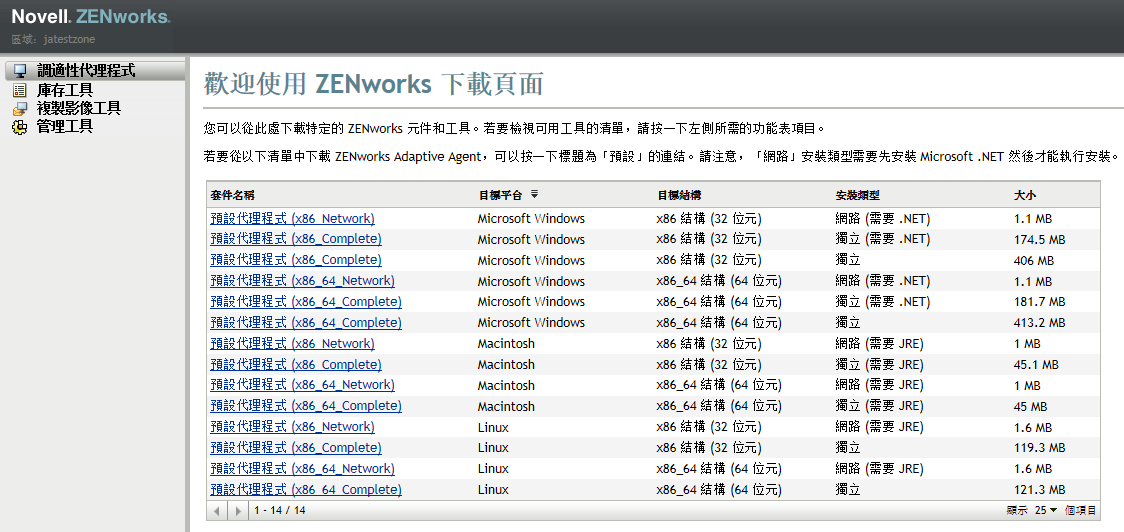 網頁瀏覽器會顯示自調性代理程式部署套件的清單。每種架構 (32 位元和 64 位元) 都會有以下類型的套件: