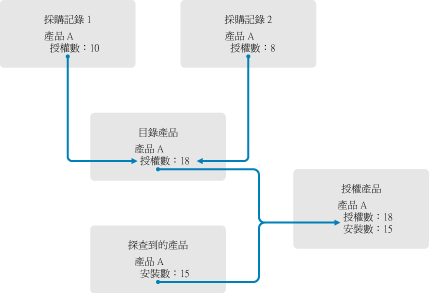 建立採購記錄來表示軟體產品的訂單或發票。採購記錄清單中的每一個明細項目都列出一個目錄產品及其授權購買數量。若多個採購記錄中都列出了某個目錄產品,則該目錄產品的總授權數等於兩個採購記錄的採購數量。在上圖中,一個採購記錄包含產品 A 的 10 個授權,另一個採購記錄包含 8 個授權。產品 A 的總授權數為 18。
