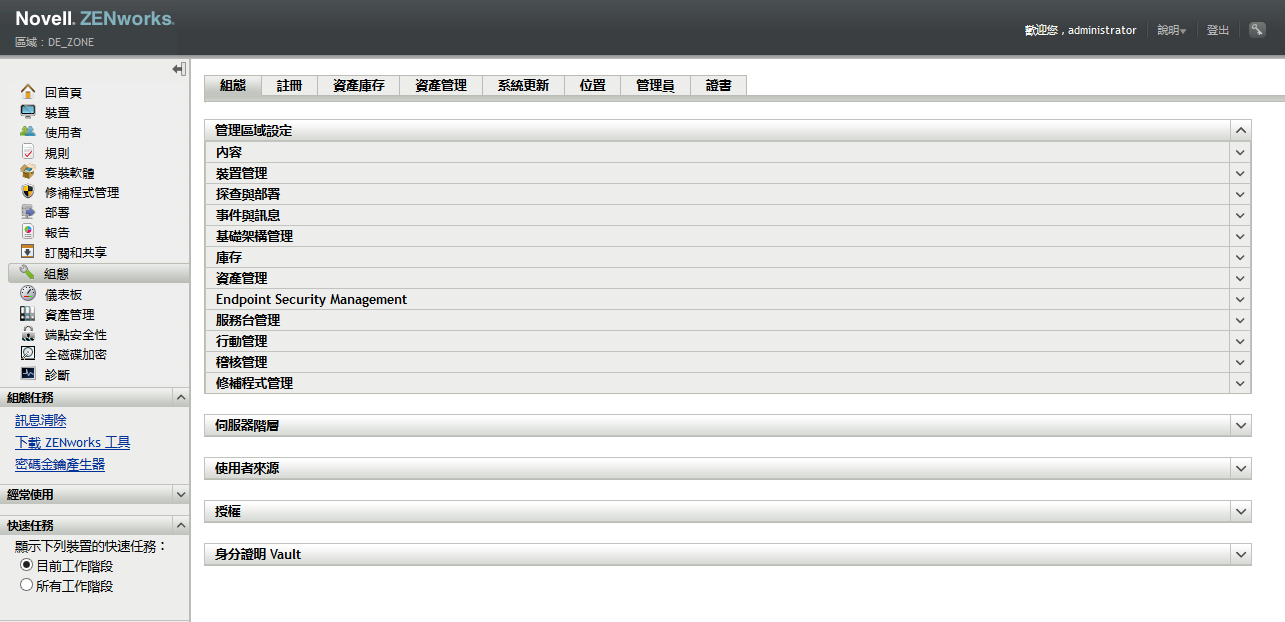 按一下 ZENworks 控制中心中的「組態」,以顯示「組態」頁面。