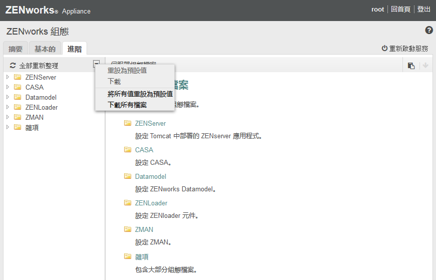 重新整理︰ 重新整理所有 ZENworks 組態。