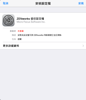 點選「註冊為受管理裝置」螢幕中的下載設定檔,以顯示設定檔安裝螢幕。點選安裝並依提示操作,以安裝設定檔並返回至「註冊為受管理裝置」螢幕。
