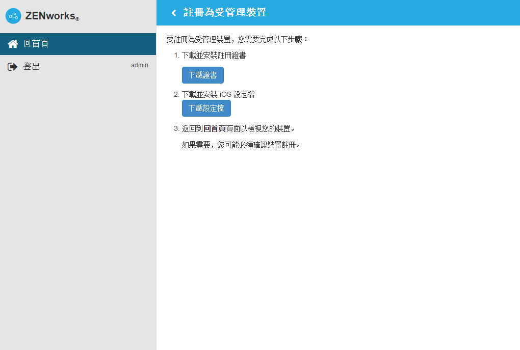 ZENworks 裝置註冊設定檔包含 ZENworks 管理裝置所需的 MDM 設定檔。