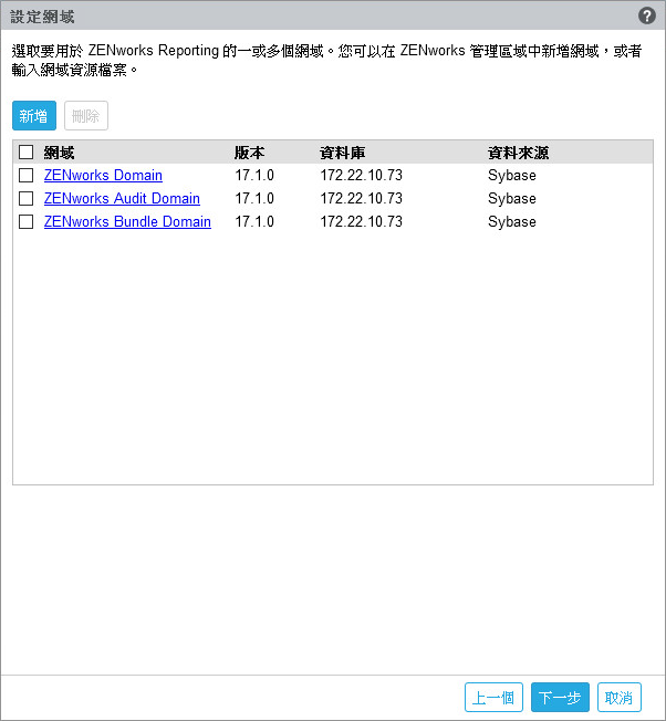指定要用於 ZENworks Reporting 的一或多個網域。您可以從 ZENworks 管理區域新增網域,也可以輸入網域資源檔案。
