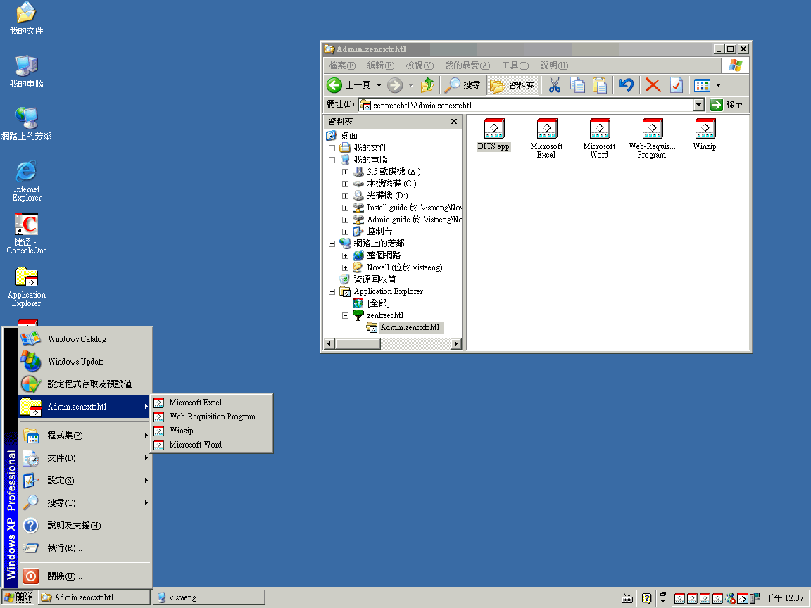 在下列範例螢幕中,Application Explorer 視窗顯示 DOC_TREE 中包含的應用程式。此外,同樣的四個應用程式還將顯示在「開始」功能表中,其中的兩個應用程式還會顯示在桌面上,另外兩個分別顯示在「快速啟動」工具列和系統匣中。