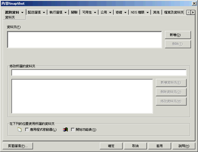 在為所有應用程式類型 (簡單、AOT/AXT、MSI、Web 和終端機伺服器) 建立的應用程式物件上,均可使用「資料夾」內容頁。