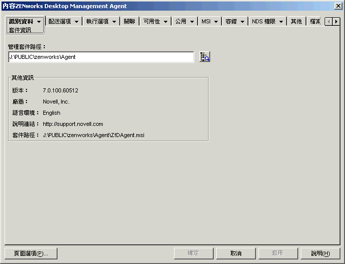 「套件資訊」內容頁 (如下所示) 顯示有關與應用程式相關聯的 Microsoft Windows Installer 套件檔案 (.msi 檔案) 之資訊。此頁僅用來提供資訊;您不能使用此頁來修改套件的資訊。