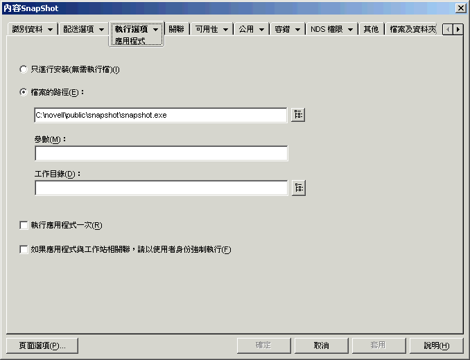 重要:ZENworks 桌面管理代辦和中間層伺服器均不支援從網路位置啟動應用程式。如果可執行檔位於網路上,且使用者安裝有網路用戶端 (Novell Client 或 Microsoft Client for Networks) 可從 NetWare® 或 Windows 伺服器啟動,則應僅使用此選項。