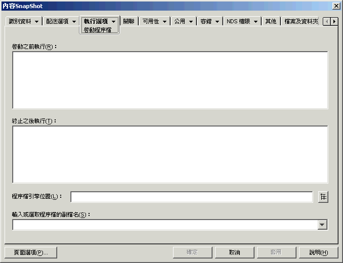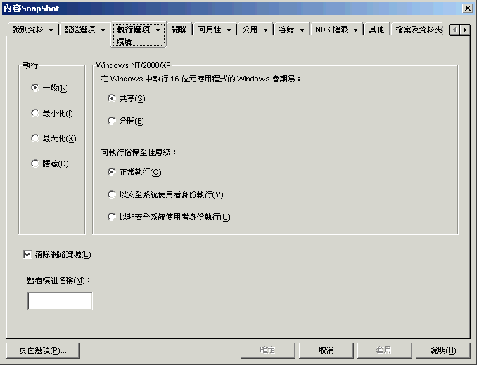 「執行選項」索引標籤包括以下各頁,可協助您設定應用程式如何在工作站上執行: