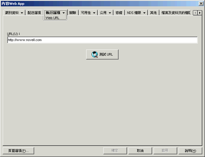 「Web URL」內容頁 (如下所示) 可指定 Web 應用程式的位置 (URL)。
