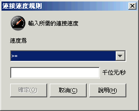 選取連接速度是必須小於 (<)、小於或等於 (<=)、大於 (>),還是大於或等於 (>=)「千位元/秒」欄位中輸入的速度。