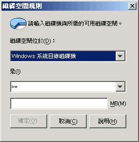 選取可用的磁碟空間是必須小於、小於或等於、等於、大於,還是大於或等於「MB」欄位中列出的容量。相應的運算子如下: