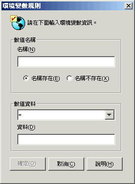 指定環境變數的名稱。選取「」選項以要求變數已存在於工作站上,或選取「」選項以要求變數不存在於工作站上。