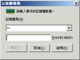 選取記憶體總量是必須小於、小於或等於、等於、大於,還是大於或等於「RAM 的 MB」欄位中輸入的記憶體容量。相應的運算子如下: