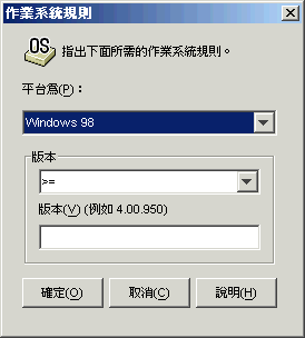 新的行為使用以下邏輯:如果應用程式僅在特定作業系統上執行,則定義作業系統配送規則。如果應用程式不要求特定的作業系統,則無需定義配送規則。依預設,未定義作業系統配送規則的應用程式在所有支援的平台 (Windows 98、Windows 2000 和 Windows XP) 上均可用。