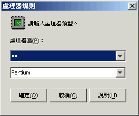 選取處理器是必須小於、小於或等於、等於、大於,還是大於或等於在處理器清單中選取的處理器類型 (386、486、Pentium、Pentium Pro、Pentium II、Pentium III)。