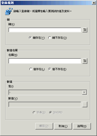 登錄: 可讓您要求特定登錄值存在或不存在。如需更多資訊,請參閱登錄。
