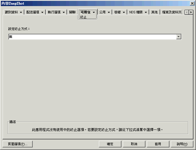「終止」內容頁 (如下所示) 可決定如果使用者在執行應用程式時其轉為不可用,則應用程式啟動器如何終止應用程式。下列情況將造成使用者無法使用應用程式: