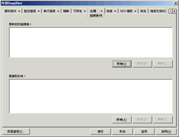 「磁碟機/埠」內容頁 (如下所示) 可決定應用程式的磁碟機映射和埠擷取。磁碟機映射和埠擷取均由工作站的網路用戶端執行,而非由應用程式啟動器執行。這需要在工作站上安裝網路用戶端 (例如 Novell Client 和 Microsoft Client) 以執行映射和擷取。