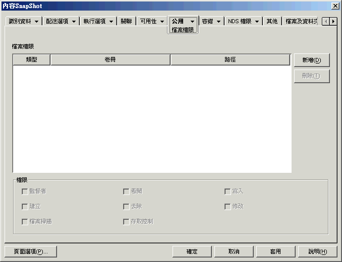 「檔案權限」內容頁 (如下所示) 可指定使用者執行應用程式所需的檔案、目錄和卷冊權限。此頁僅適用於 NetWare 檔案系統權限。無法透過 eDirectory 指定 Microsoft Windows 檔案系統權限。