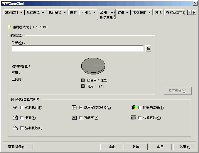 「複製影像」內容頁 (如下所示) 可讓您為應用程式物件建立影像檔案。您可以使用該影像檔案做為基本影像檔案之附加影像。