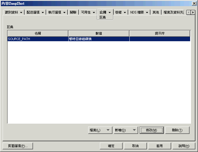 「來源」內容頁 (如下所示) 可指定包含安裝套件 (應用程式啟動器可從中配送應用程式) 的其他網路位置。如果應用程式物件是從 .aot 或 .axt 檔案建立的,則安裝套件必須是 snAppShot 套件 (.aot、.axt 和 .fil 檔案)。如果應用程式物件是從 .msi 檔案建立的,則安裝套件必須是 Microsoft Windows Installer 套件 (.msi 檔案)。當原始來源位置不可用時才會使用來源清單,在這種情況下,應用程式啟動器會從清單中的第一個位置開始向下搜尋,直到找到可存取的套件為止。