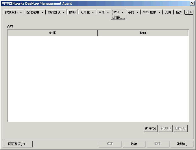 「MSI」索引標籤包括以下各頁,可協助您設定和管理透過 Microsoft Windows Installer 安裝的 MSI 應用程式配送: