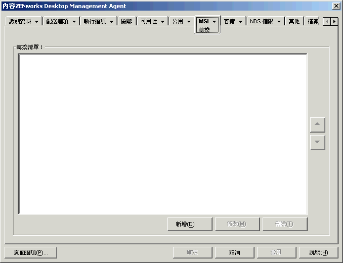 「轉換」內容頁 (如下所示) 可列出 Microsoft Windows Installer 在配送過程中套用至 MSI 套件的轉換。轉換會新增、刪除或變更 MSI 套件中的內容,可針對不同的使用者群組自訂安裝。