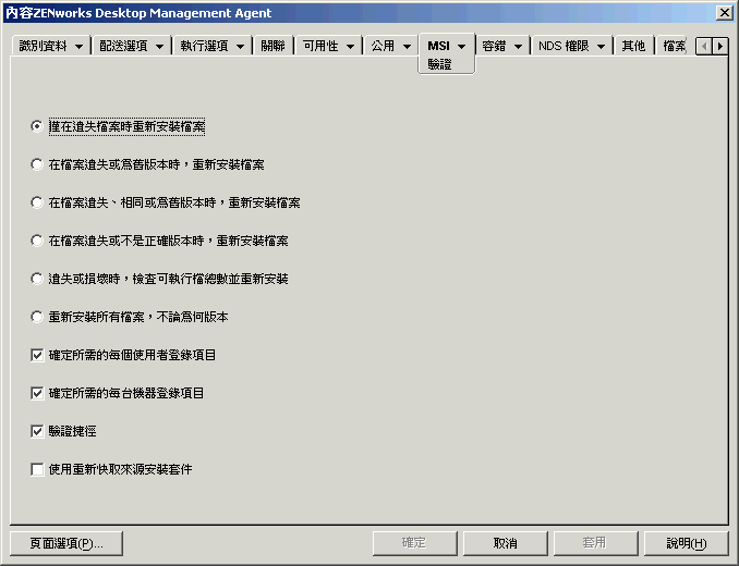 「驗證」內容頁 (如下所示) 可決定 Microsoft Windows Installer 在得到指示來驗證應用程式時所執行的動作。