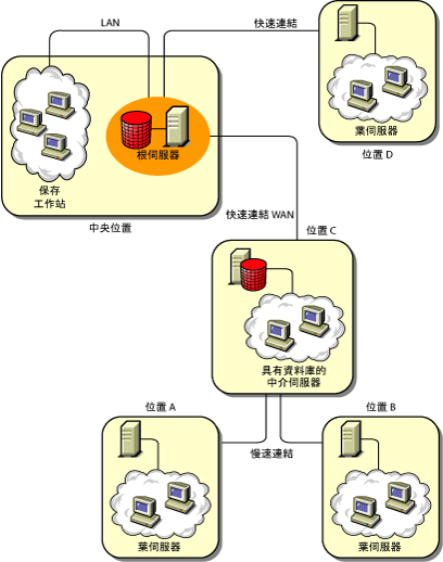 在此情況中,網路由四個遠端位置 (A、B、C 和 D) 和一個中央位置組成。位置 A 和位置 B 透過慢速連結連接至位置 C,並且不直接連接至中央位置。位置 C 透過快速 WAN 連結與中央位置相連。位置 D 透過快速連結直接連接至中央位置。在位置 C 管理位置 A、B 和 C。