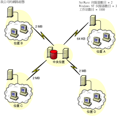 下圖將說明伺服器位於不同位置的企業網路組織。