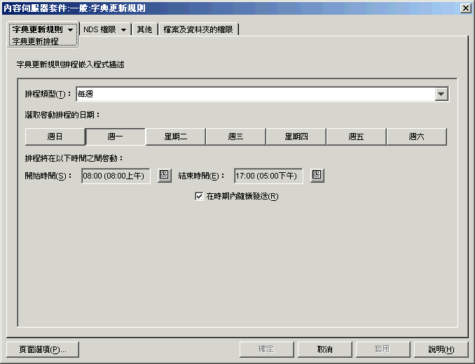 將上捲伺服器用作更新來源︰ 如果您希望字典更新服務將上捲規則中設定的庫存伺服器用作字典更新的來源,請選取此選項。如果不選取此選項,則字典更新服務將使用以下設定。