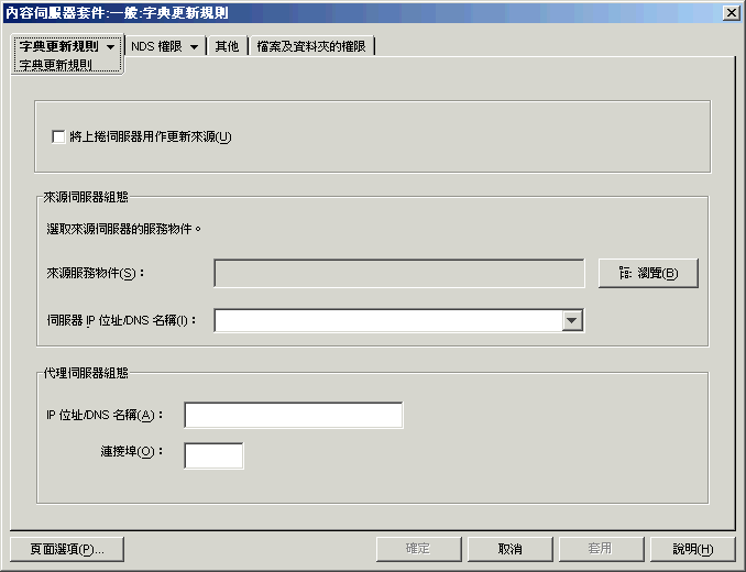來源服務物件︰ 瀏覽並選取可提供字典更新之庫存伺服器的 DN。