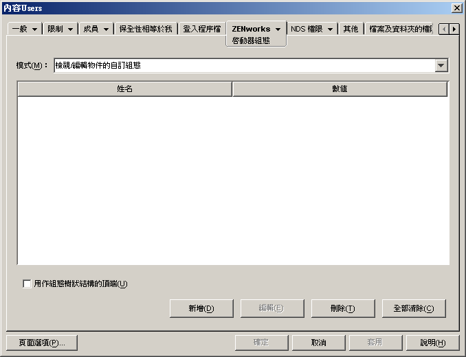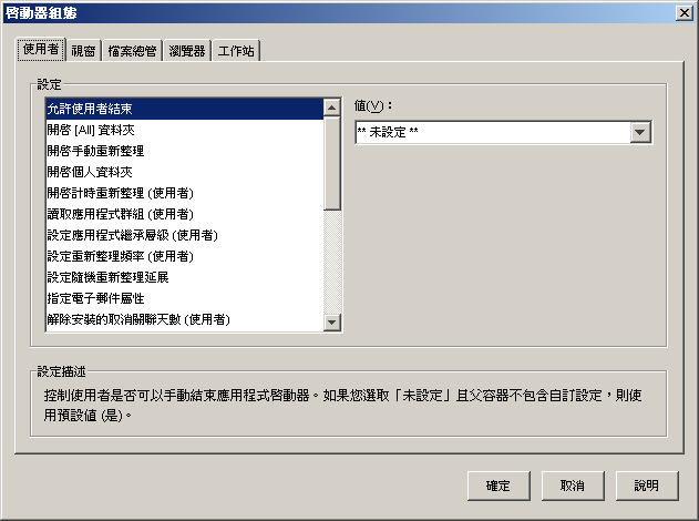 依據您設定的物件類型,「使用者」索引標籤或「工作站」索引標籤可能不可用。「使用者」索引標籤不在工作站或工作站群組物件上顯示,「工作站」索引標籤不在使用者或使用者群組物件上顯示。