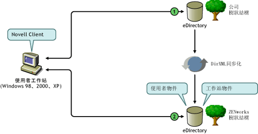 如果您擁有 eDirectory 公司樹狀結構,則無論您選擇使用 Novell Client 還是 ZENworks 管理代辦與 ZENworks 中間層伺服器的組合,均可進行單獨的 ZENworks 樹狀結構驗證 (在使用者物件與公司樹狀結構同步的情況下)。