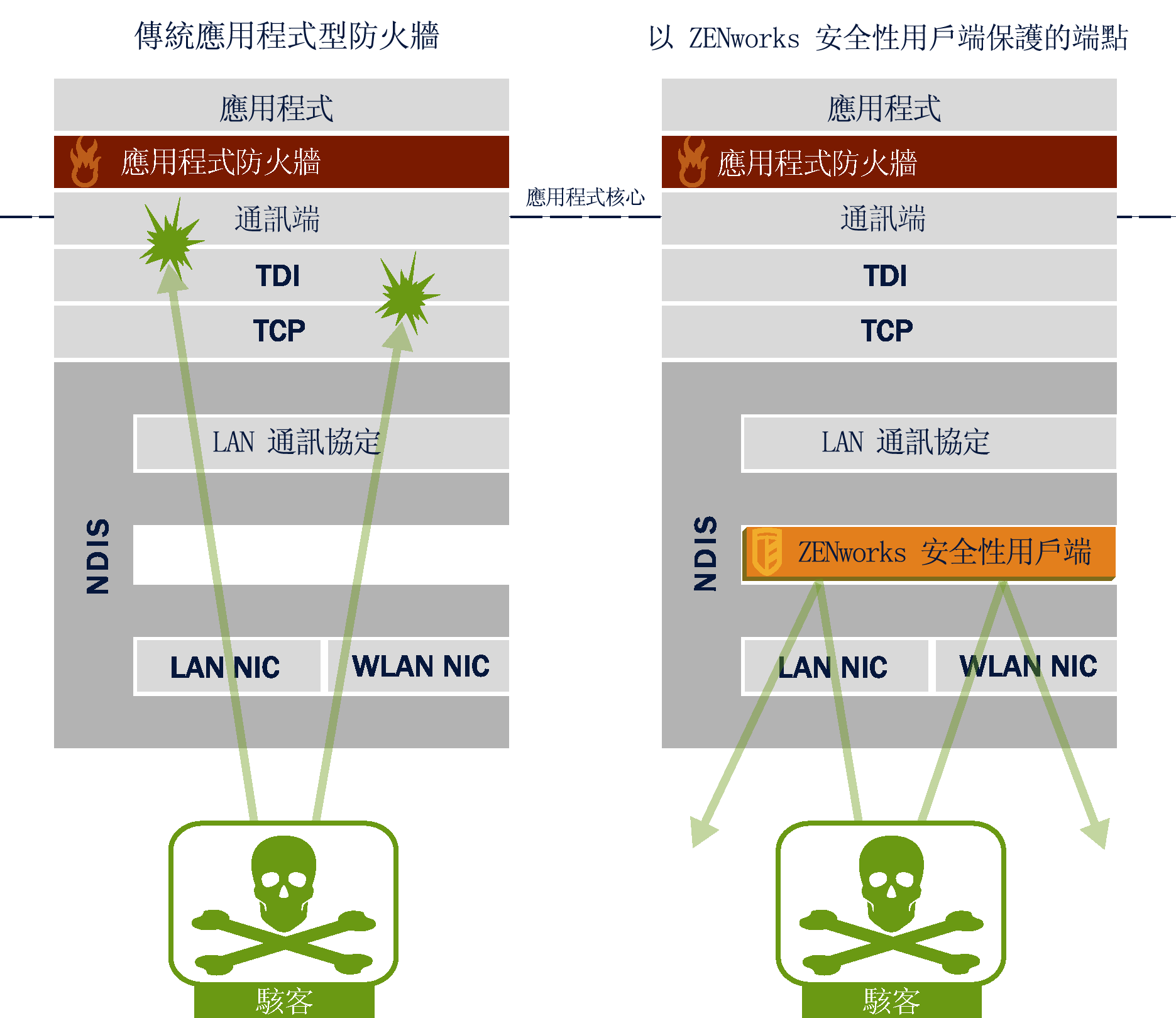 在保護行動裝置時,ESM 會優於僅在應用程式層運作、或以 Firewall-Hook 驅動程式運作的一般個人防火牆技術。ESM 用戶端安全性已整合至每張網路介面卡 (NIC) 的 Network Driver Interface Specification (NDIS) 驅動程式中,並且可以在流量進入電腦時便開始提供安全性保護。圖 1-2, NDIS 層防火牆的效用 顯示了 ESM 與應用程式層防火牆和篩選器驅動程式之間的差異。