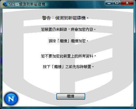 警告:若要防止加密,請在按一下「」之前先移除磁碟機。按一下「」以加密磁碟機,或者在移除設備後關閉視窗。
