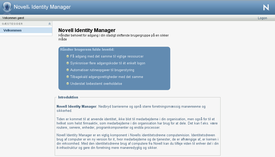 Dette bringer dig som standard til siden Velkommen gæst i brugerprogrammet: