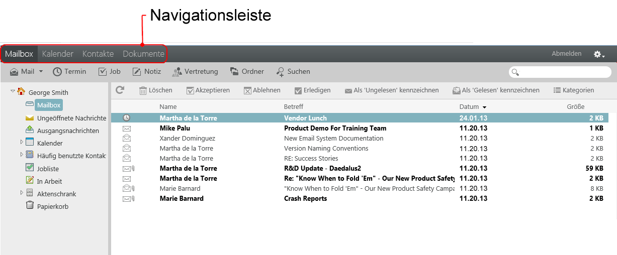 Hauptsymbolleiste: Die Hauptsymbolleiste enthält die am häufigsten verwendeten Funktionen wie „Neuer Termin“ und „Neue Mail“. Diese Hauptsymbolleiste befindet sich ganz oben auf der Hauptseite.
