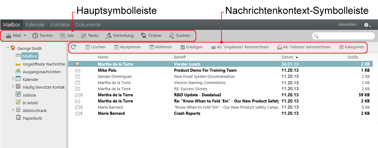 Mithilfe der Symbolleiste können Sie auf viele Funktionen und Optionen von WebAccess zugreifen. Die oben in einem Ordner oder einer Nachricht angezeigte Symbolleiste ist kontextbezogen. Die jeweiligen Schaltflächen beziehen sich auf die Optionen, die in dem jeweiligen Kontext am häufigsten verwendet werden.