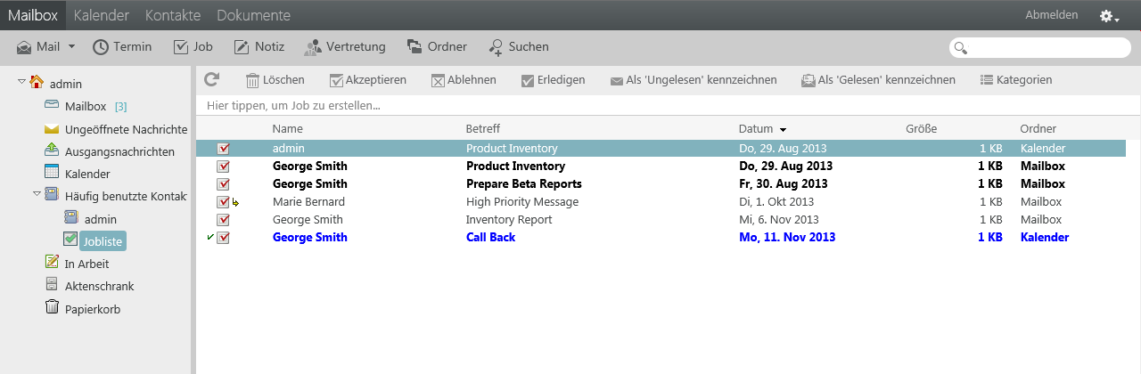 Wenn Sie einen Job aufgeben oder akzeptieren, wird er automatisch im Joblistenordner angezeigt. Zudem kann jede Nachrichtenkategorie (Mail, Termin, Job, Notiz, telefonische Nachricht) im Joblistenordner abgelegt werden. Sie können beispielsweise eine Email-Nachricht im Ordner „Jobliste“ platzieren, um sich selbst daran zu erinnern, dass Sie sie bearbeiten müssen.