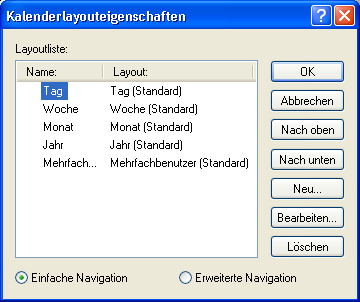 Im Dialogfeld "Kalenderlayout-Eigenschaften" können Sie das Layout zur Anzeige Ihrer Tages-, Wochen-, Monats-, Jahres- und Mehrfachbenutzerkalender ändern.