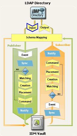 Die Metaverzeichnis-Engine verarbeitet Identitätsdepotdaten und -ereignisse unter Verwendung von XML. Die Metaverzeichnis-Engine verwendet zur Bearbeitung des Datenflusses zwischen zwei Systemen einen Regelprozessor und eine Datentransformations-Engine: