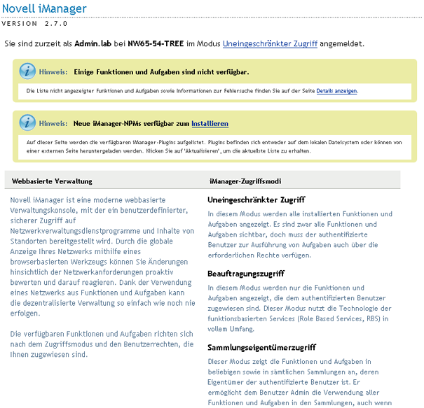 Wenn keine Aufgabe ausgewählt wurde, zeigt der Inhaltsrahmen die iManager-Startseite mit allgemeinen Informationen über Ihre iManager-Zugriffsrechte an.