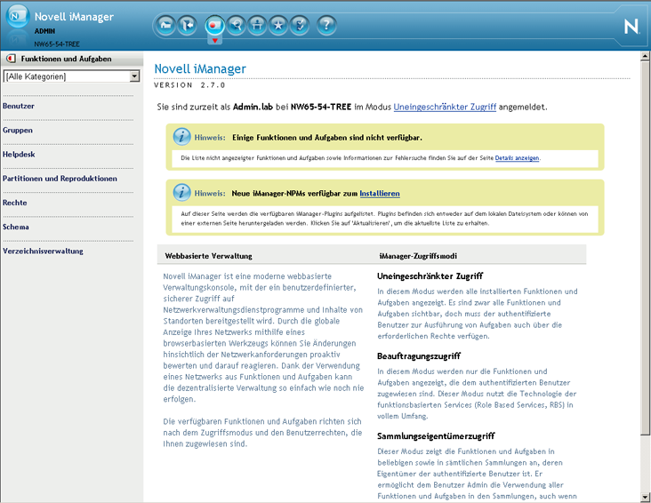 Abbildung 3-1 iManager-Oberfläche mit Standardansicht "Funktionen und Aufgaben"
